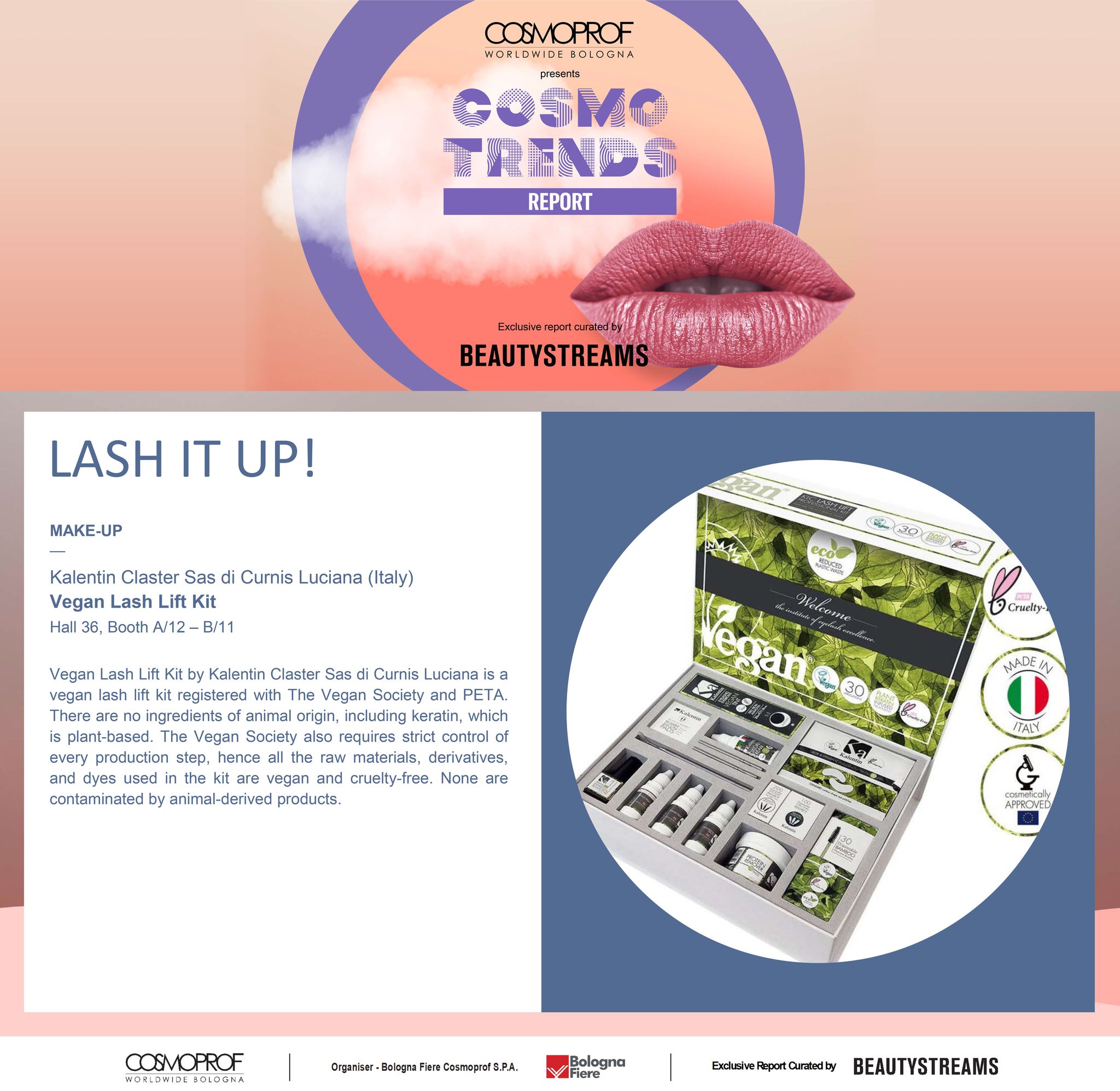 Kalentin è stata selezionata dal report CosmoTrends, una guida esclusiva per comprendere al meglio l'evoluzione del mercato della bellezza, per il kit vegano per laminazione ciglia